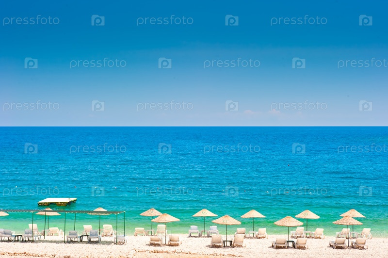 Пустой пляж с белым соломенныйми зонтами