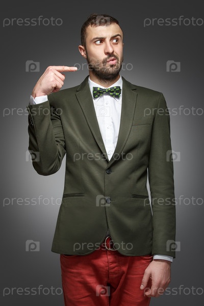 Молодой человек в зеленом костюме указывает направо
