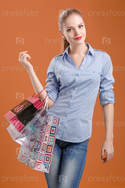 Девушка в голубой рубашке и джинсах с покупками на бежевом фоне