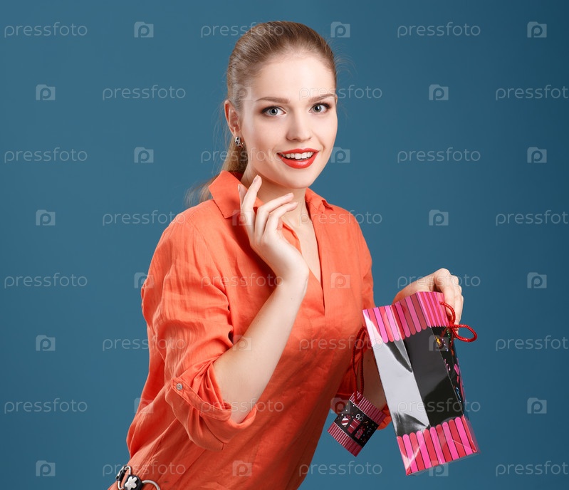 Девушка в оранжевой рубашке и джинсах с пакетом на синем фоне