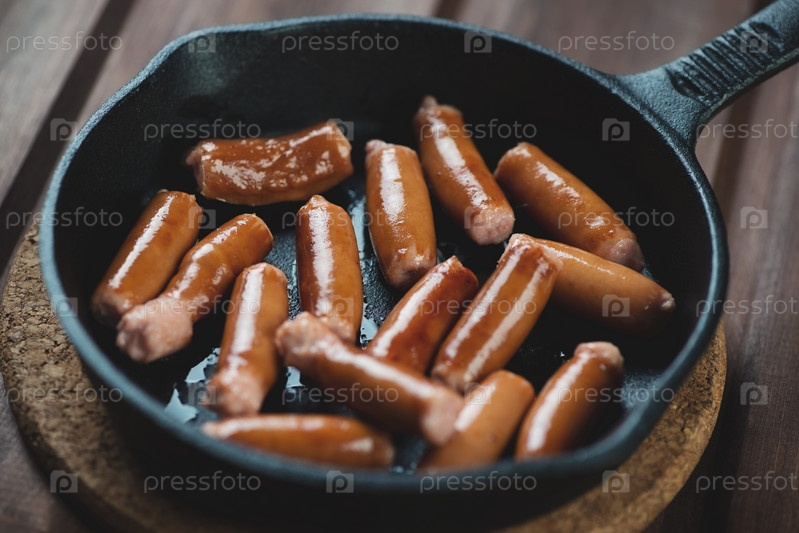 Жареные сосиски в чугунной сковороде, крупный план