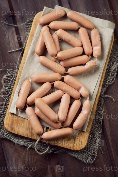 Сосиски мини на разделочной доске, вид сверху