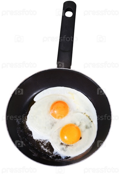 Яичница в сковороде, изолированной на белом