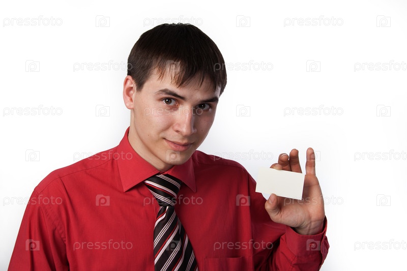 Молодой человек в рубашке и галстуке держит визитную карточку, изолированный на белом фоне