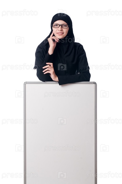 Мусульманская женщина с пустым баннером на белом фоне