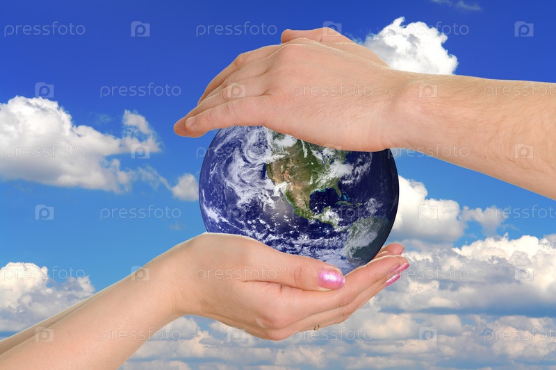 Женские и мужские руки держат Землю на фоне облачного неба