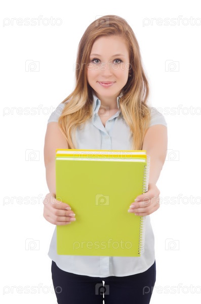 Молодая студентка с книгами на белом фоне