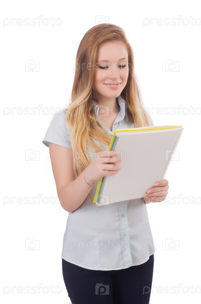 Молодая студентка с книгами на белом фоне