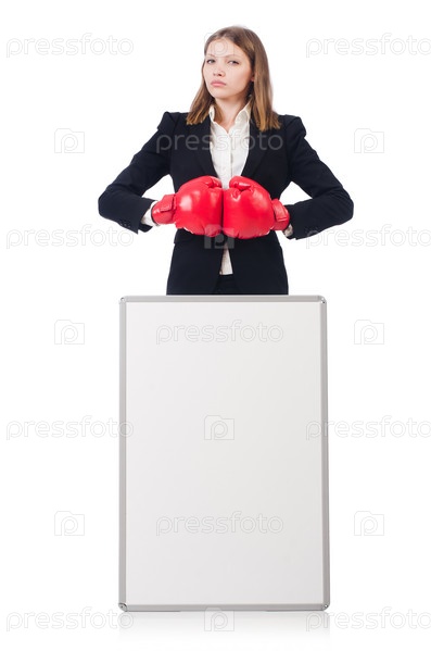 Бизнес-леди с боксерскими перчатками на белом фоне