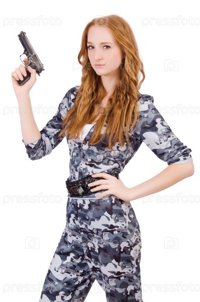 Рыжая женщина в солдатской форме с оружием на белом фоне