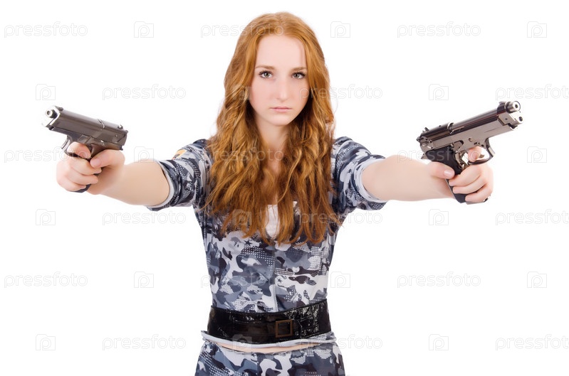 Рыжая женщина в солдатской форме с оружием на белом фоне