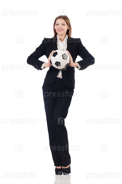 Бизнес-леди с футбольным мячом на белом фоне