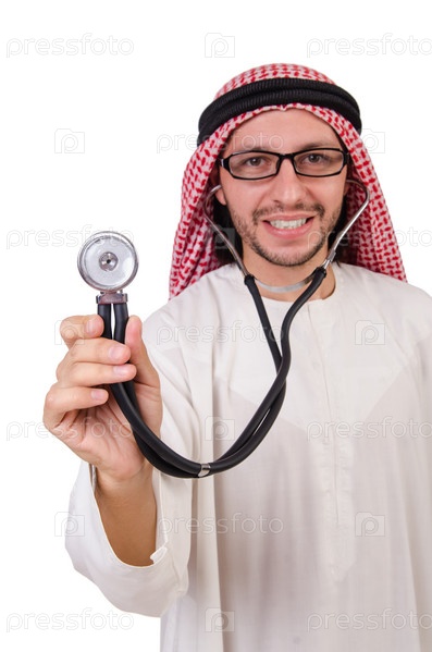 Арабский врач со стетоскопом на белом фоне
