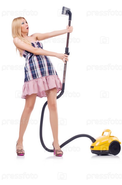 Молодая женщина с пылесосом на белом фоне