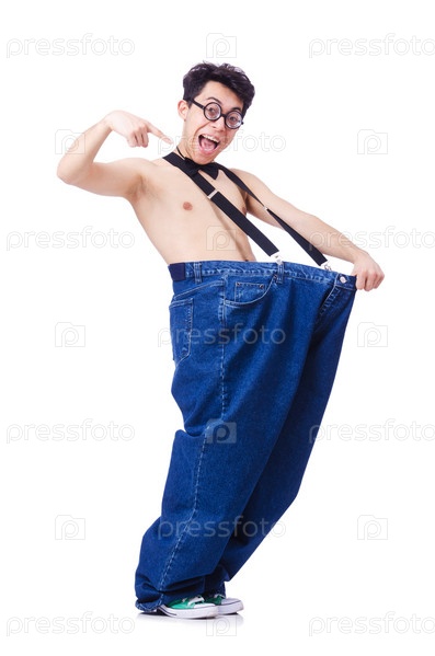 Забавный мужчина с брюками, изолированный на белом фоне