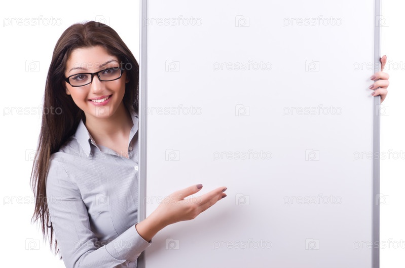 Молодая женщина с чистой доской на белом фоне