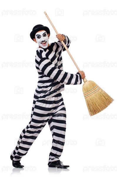 Заключенный с метлой, изолированный на белом фоне
