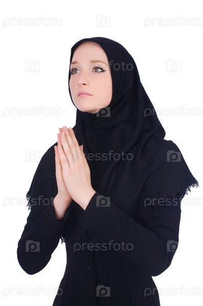 Молодая мусульманка молится, изолированная на белом