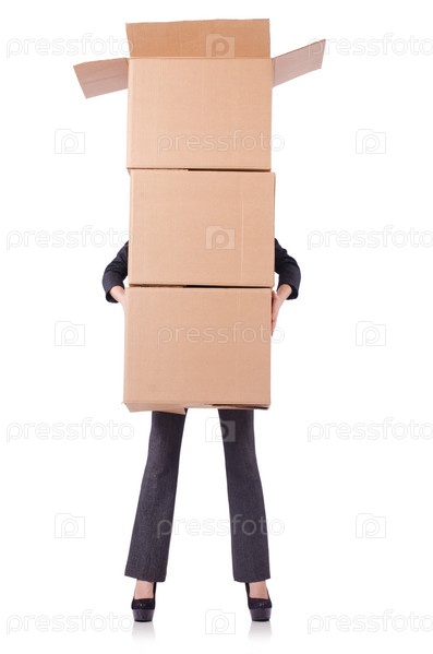 Деловая женщина с коробками на белом фоне
