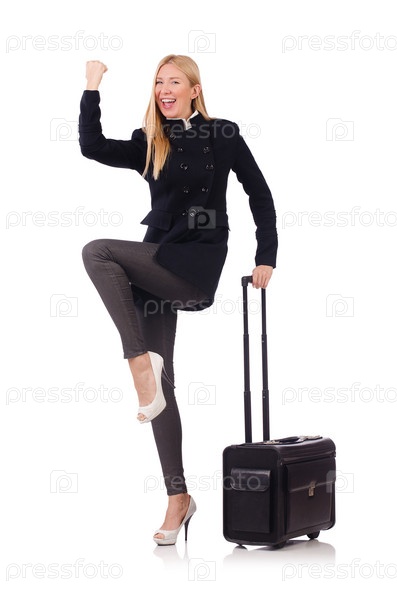 Деловая женщина с чемоданом на белом фоне