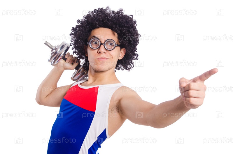 Забавный мужчина с гантелями