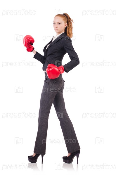 Бизнес-леди с боксерскими перчатками на белом фоне