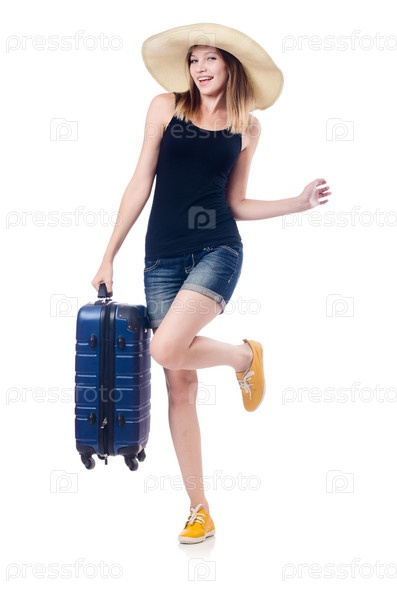 Девушка с чемоданом, изолированная на белом фоне