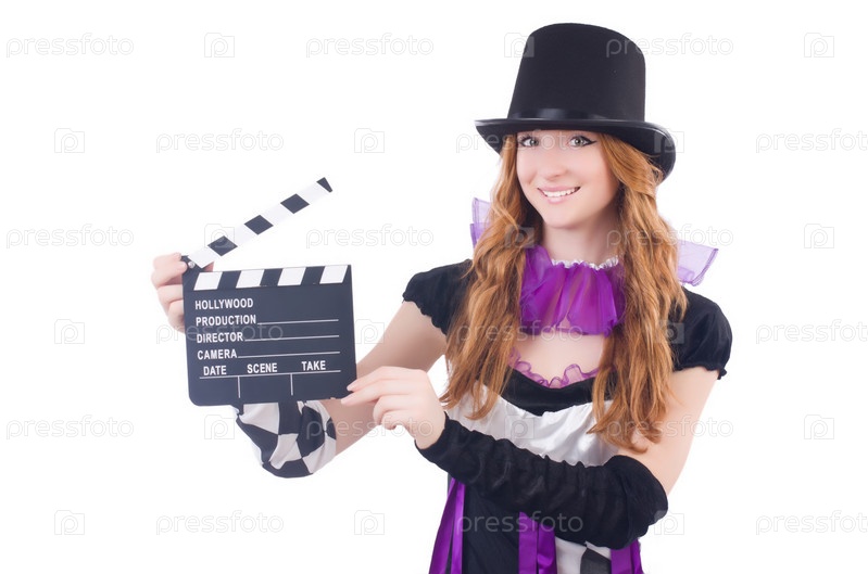 Женщина с кинохлопушкой, изолированная на белом фоне