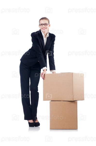 Деловая женщина с коробками на белом фоне