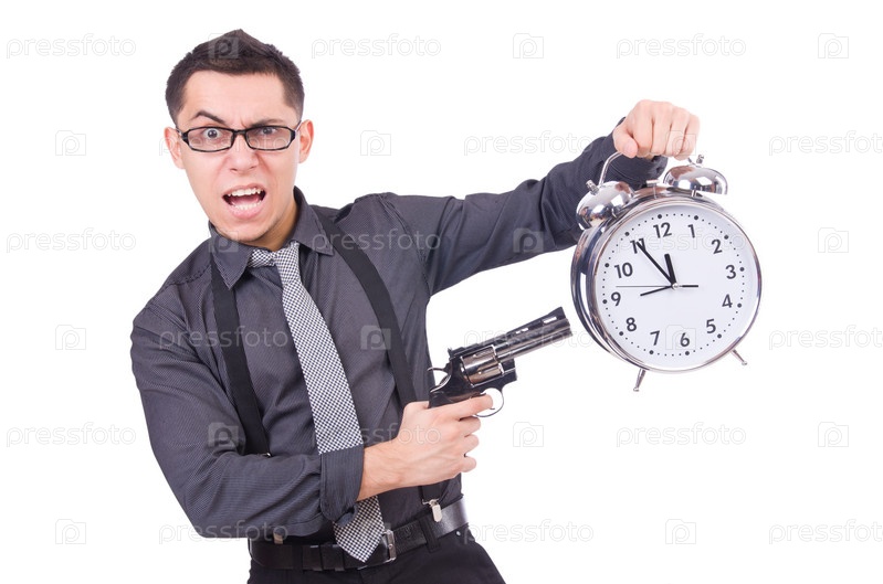 Смешной бизнесмен с часами и пистолетом, изолированный на белом