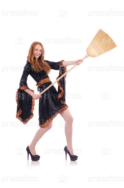 Симпатичная ведьма с метлой на белом фоне
