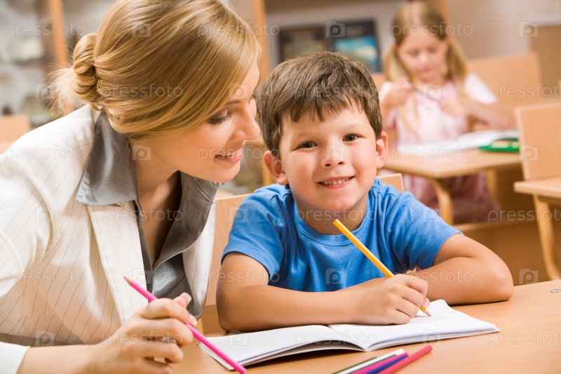 Фото счастливого школьника, смотрящего на камеру с учителем рядом