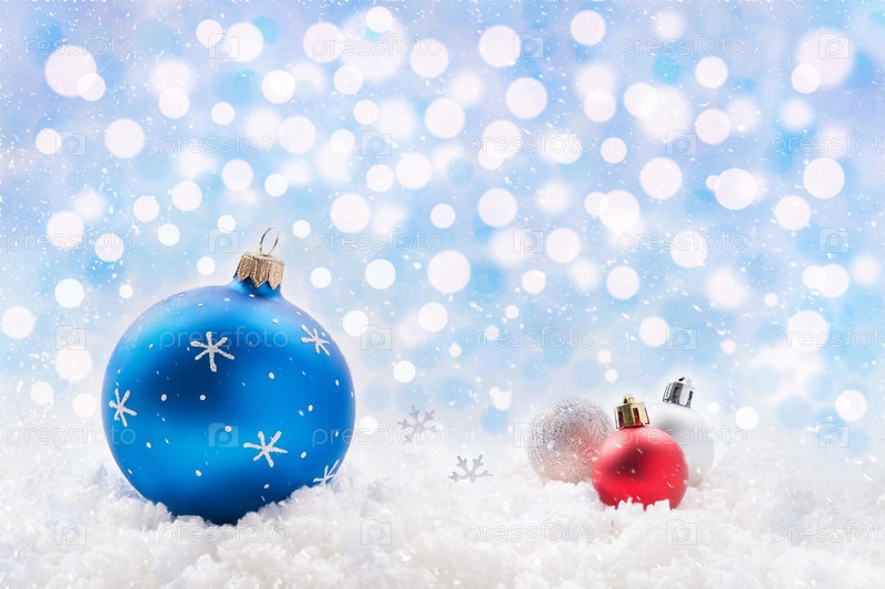 Елочные украшения в снегу. Новогодний фон