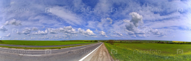 Прямая пустая дорога. Голубое небо без облаков и зеленая трава на обочине