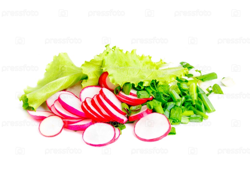 Свежий салат и нарезанный редис, изолированные на белом