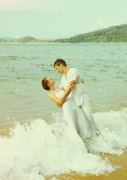 Пара на пляже, тонированная фотография