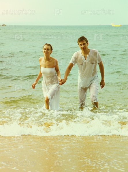 Пара на пляже, тонированная фотография