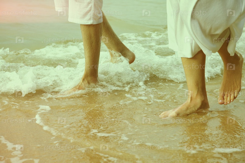 Ноги молодой пары идут по пляжу, тонированная фотография