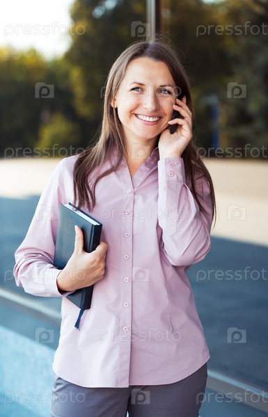 Бизнес-леди с телефоном и блокнотом на улице
