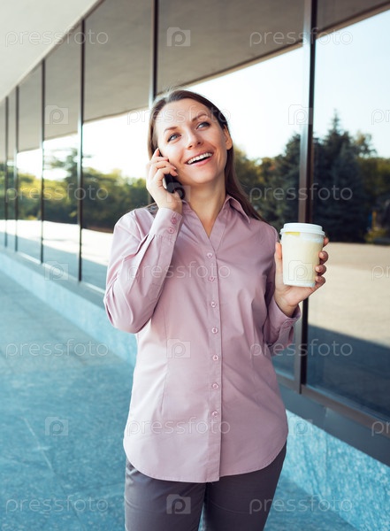 Бизнес-леди с телефоном и кофе у здания