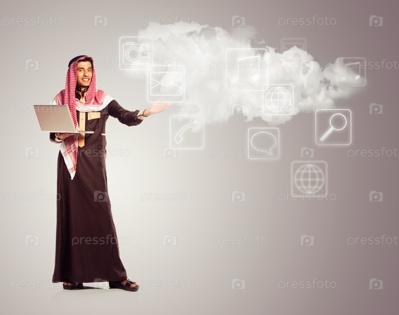 Араб с ноутбуком показывает виртуальные иконки из облачной службы