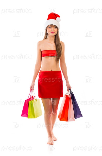 Красивая девушка в шапке Санта-Клауса с пакетами на белом фоне