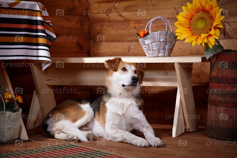 Собака лежит под скамьей в деревенском доме