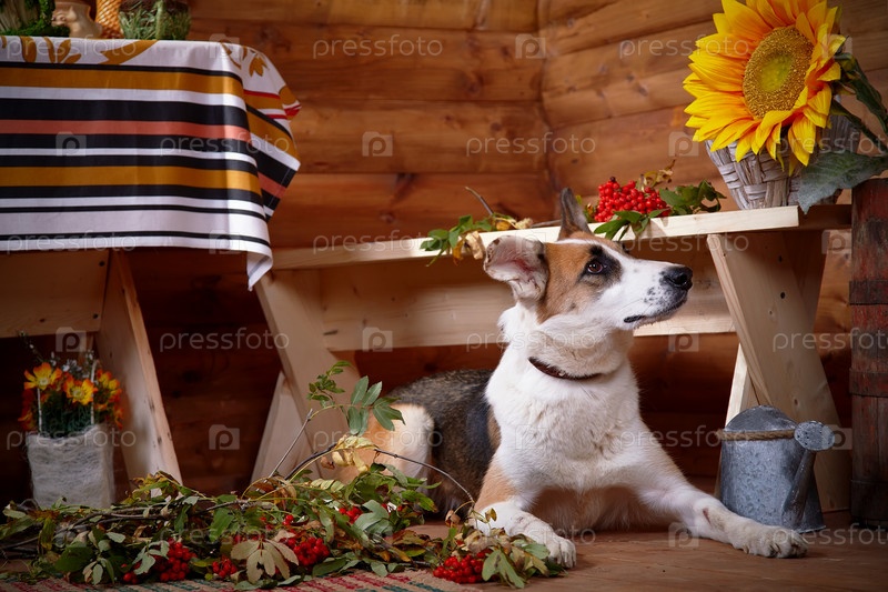 Собака с рябиной в деревенском доме