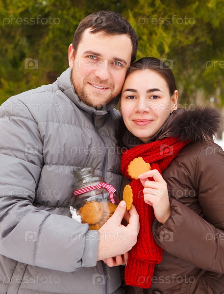 Счастливая молодая пара в зимнем парке