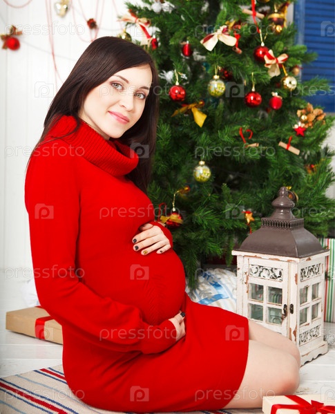 Беременная женщина сидит возле елки