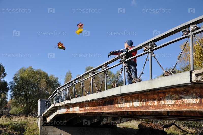 Мальчик на мосту думает о желании и бросает кленовый лист в воду