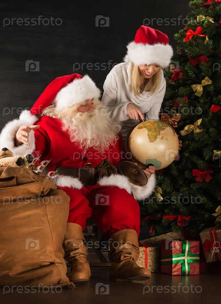 Санта Клаус с помощницей держат глобус и обсуждают их маршрут