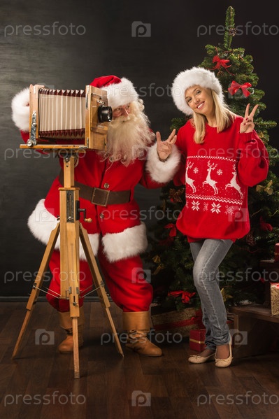 Санта-Клаус и жизнерадостная женщина со старой деревянной фотокамерой у себя дома возле елки