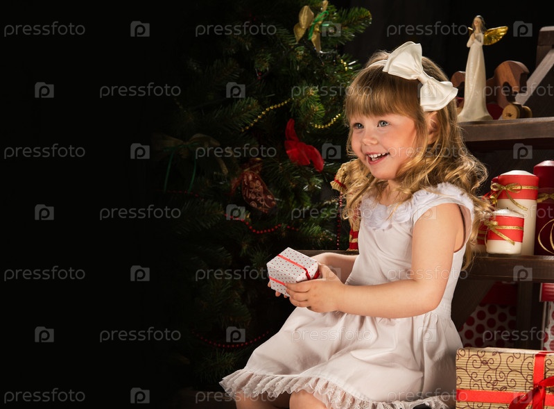 Счастливая маленькая девочка с рождественским подарком сидит возле елки